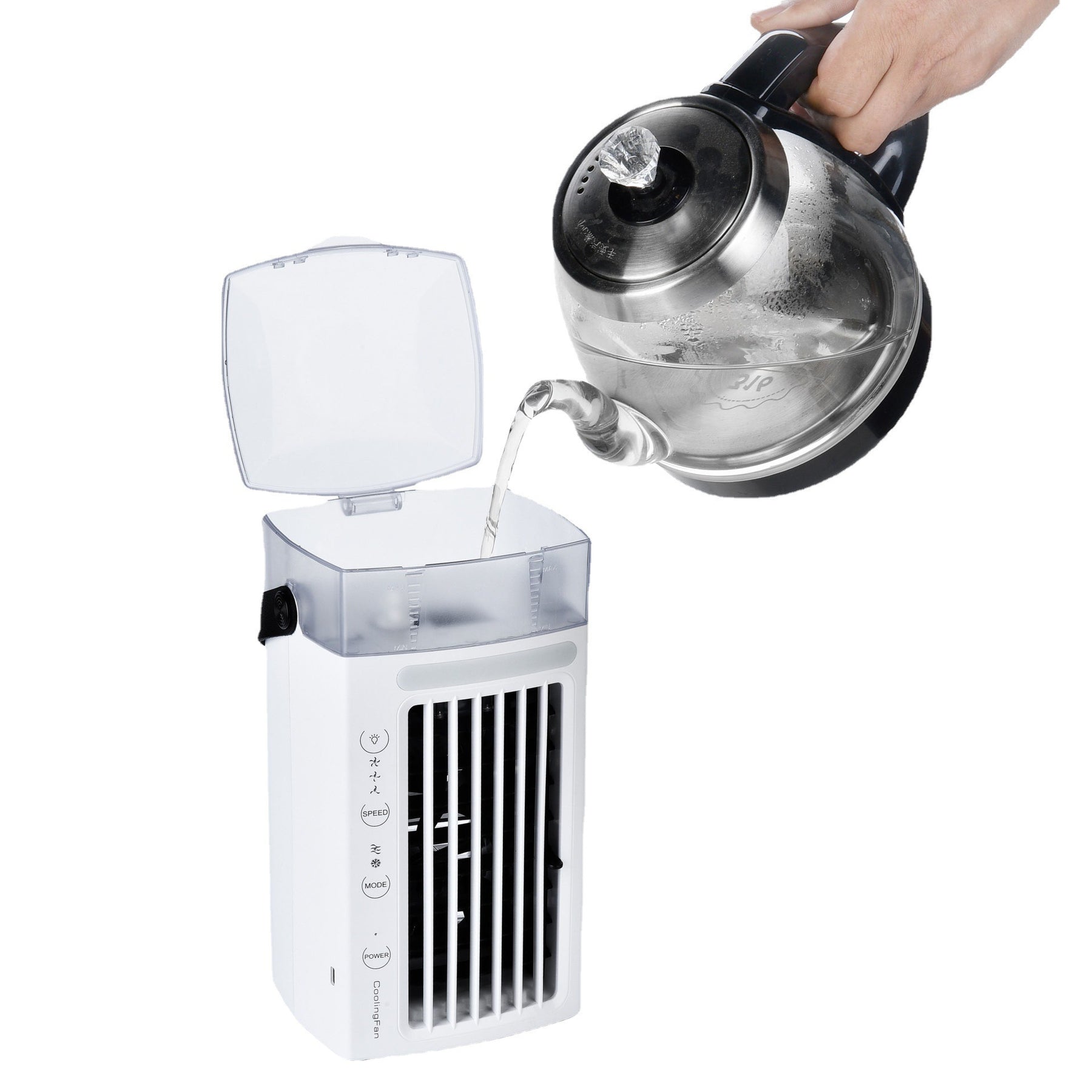 Product information: Product Name: air conditioner fan Water tank capacity: 480ml Maximum evaporation capacity: 50ml/h Maximum wind speed: ≥ 2.8 m/s Power supply: DC5V 1.5A Power: 7W Product Size: 120*136 * 260mm